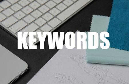 Text KEYWORDS, sketches and keyboard on dark background
