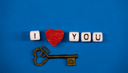 Golden Keys to a red heart on a blue background. Love Valentines Day