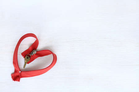 red clothes lightning with keychain key on light wood surface top view / heart open to love