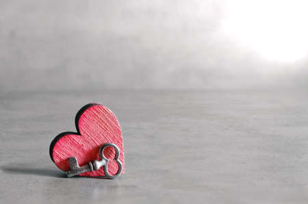 Silver key and red wooden heart on gray background. Valentines Day. Holiday concept.