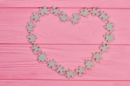 Puzzle pieces forming heart frame. Heart frame made from cardboard puzzles on colorful wooden background. Love to game.
