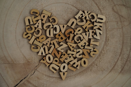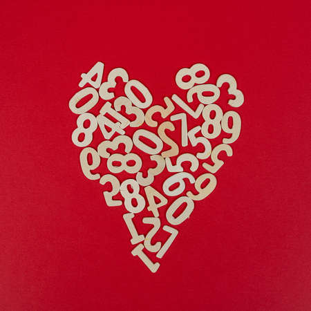 the shape of the heart formed with wooden numbers on a red background