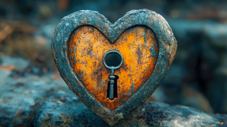 A rustic heart-shaped frame with a glowing background and a vintage key hanging in the center, symbolizing love and mystery.