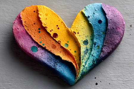 A vibrant heart-shaped paper art piece featuring a spectrum of colors from yellow to purple. the textured layers and speckled patterns create a visually striking composition, symbolizing love, diversity, and unity. Generative AI
