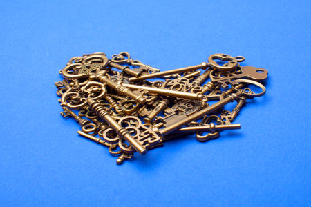 Old, vintage keys in the shape of a heart isolated on blue bacground
