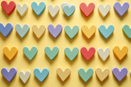 Colorful heart shapes arranged on a yellow background, creating a vibrant and cheerful pattern ideal for celebrations and romantic themes
