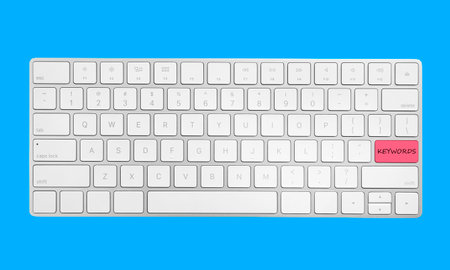 Word Keywords, computer keyboard and key on light blue background. SEO direction