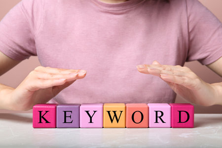 Woman demonstrating colorful cubes with word KEYWORD at gray marble table, closeup