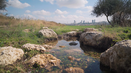 Shallow stream of clear water meanders through a grassy area, bordered by various sized rocks. The stream reflects the sunlight and the surrounding landscape. Beyond the stream, a line of distant buildings and trees is visible in the background.