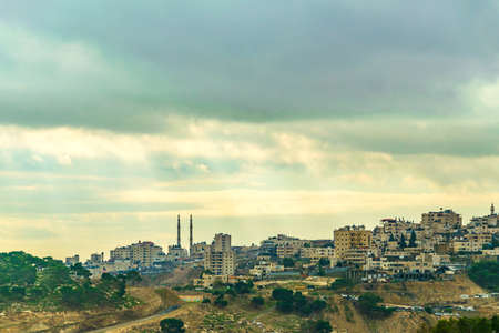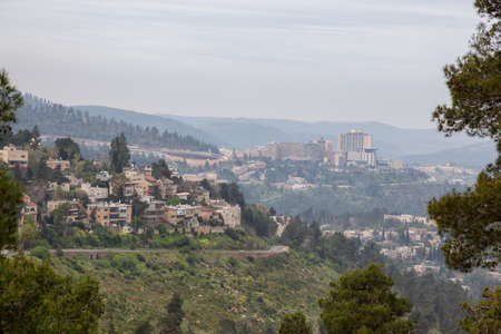 Beautiful view of residential homes on top of a hill in a city during a cloudy day. Taken in Jerusalem, Israel.