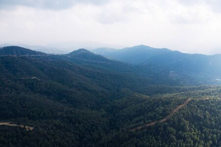 Cyprus mountain landscape aerial view in fog, mist or low lying clouds in sunlight. Beautiful mediterranean nature panorama.