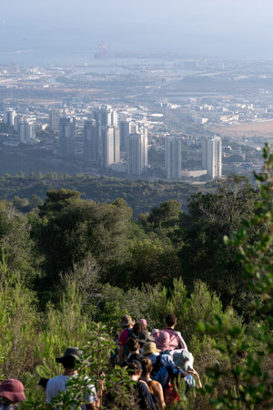 Group hiking trail overlooking modern city skyline