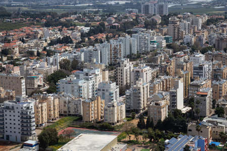 Haifa, Israel - October 2018: Aerial view of downtown Haifa, Residential area, Northern Israel. Solar panels and roof boilers