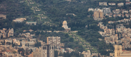 Sunrise view of downtown Haifa, with the Bahai Shrine and the harbor. Northern Israel