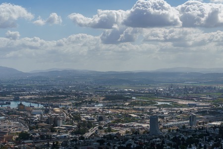 Panoramic view of the harbor port of Haifa, with downtown Haifa, the harbor, the industrial zone in a sunny summer day. Haifa, Northern Israel