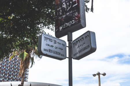 Tel Aviv/Israel-9/10/18: Rehov Hayarkon and David Ben Gurion Boulevard name signs in Tel Aviv, Israel. Street name signs are most often posted at intersections and identifying crossing streets