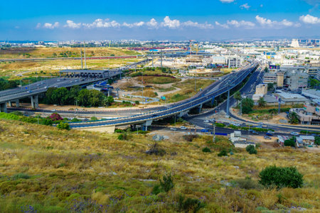 Haifa, Israel - June 13, 2019: View of the Check Post junction, and bay area, with transportation centers and various businesses, in Haifa, Israel