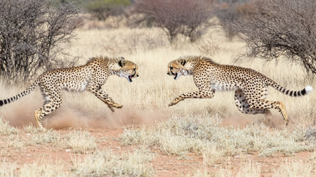 This captivating image captures two cheetahs in mid-chase across a dry savanna, showcasing their speed and agility. The golden grass and sparse vegetation create a striking backdrop, highlighting the intense action of these magnificent predators.