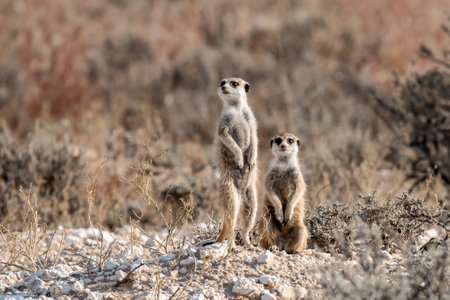 Group of meerkats standing in the desert, Kalahari desert, South Africa