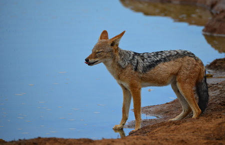 Black-backed jackal, Canis mesomelas, single mammal by water, South Africa