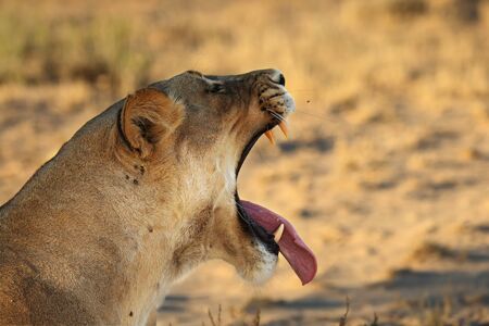 Lioness (Panthera leo) laying in sand in Kalahari Desert. Lioness with open mouth show teeth. Morning sun. Lioness portrait.