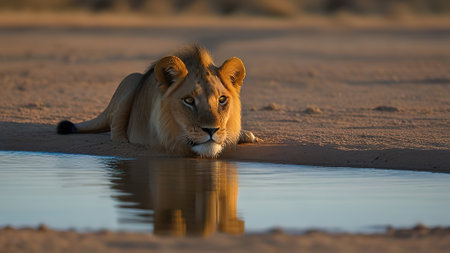 Lion drinking water at sunset in Etosha National Park, Namibia