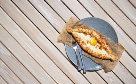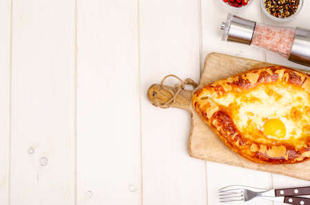 Khachapuri in Adjarian. Open pie with mozzarella and egg. Georgian cuisine.