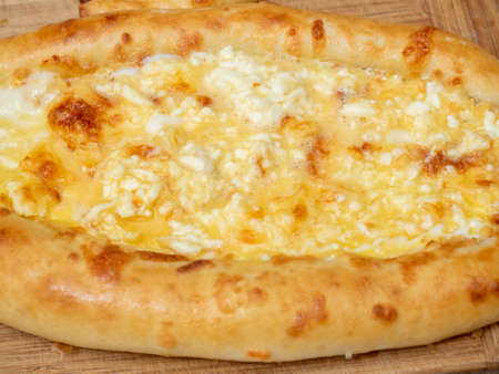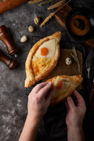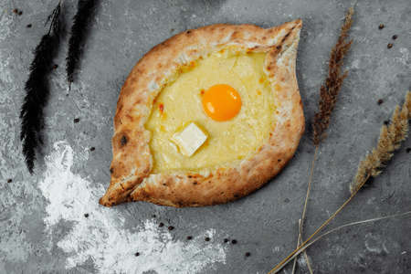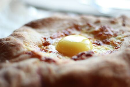 Khachapuri in Adzharian with Adyghe cheese, cheese and yolk. Traditional Caucasian food