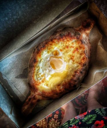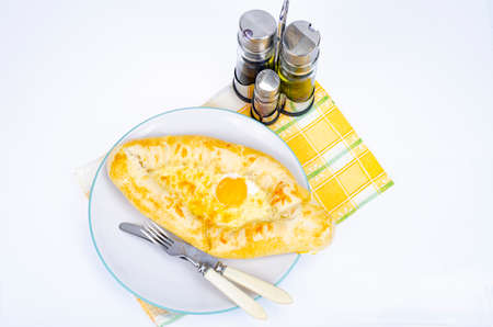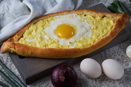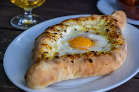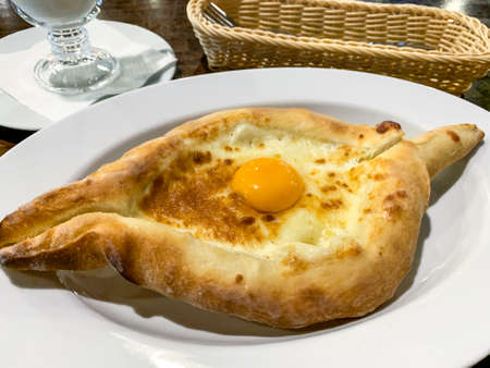 Ajarian or Adjaruli khachapuri, filled with cheese and topped with a raw egg and butter - traditional dish of georgian cuisine