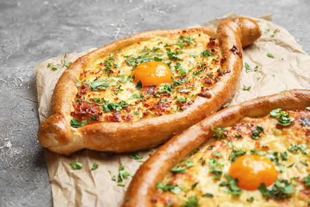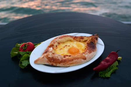 Traditional turkish baked dish khachapuri or khachapuri with egg