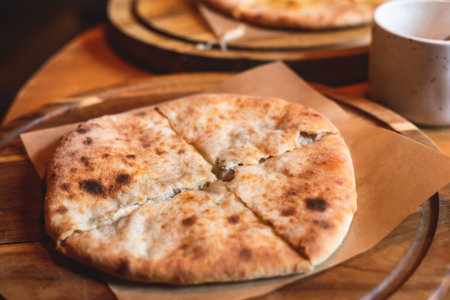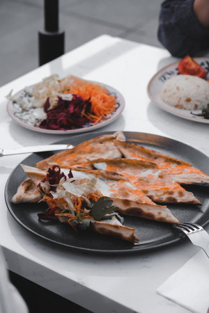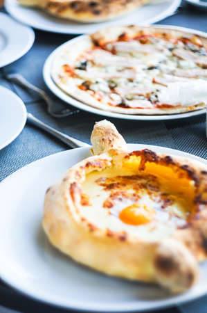 Close-up on a table in a restaurant cooked traditional Georgian dish khachapuri