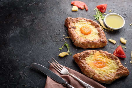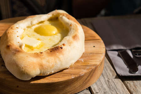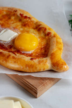 Homemade Adjarian khachapuri with sulguni cheese and egg yolk and Butter.Traditional Georgian cuisine