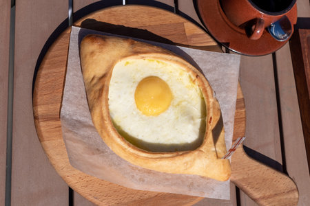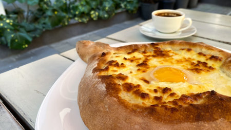 Traditional adjarian khachapuri with melted cheese and egg yolk served on a white plate with a cup of coffee on a wooden table outdoors, concept of Georgian cuisine and travel