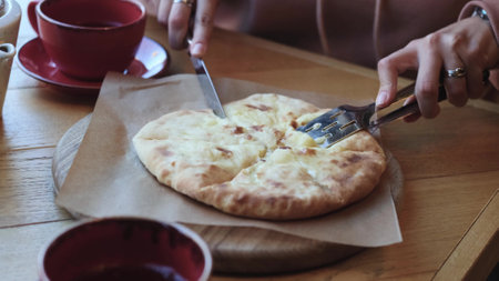 A woman is happy to eat an appetizing and tasty Ossetian pie with potatoes and cheese, sitting in a national cafe