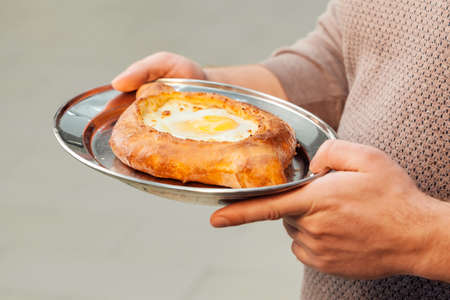 Adjarian khachapuri in restaurant. Open bread pie with cheese and egg yolk.