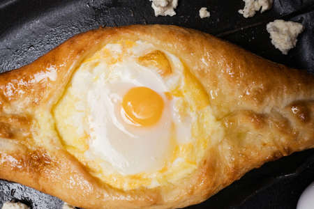 Caucasian Georgian cuisine, Adjarian khachapuri with fresh egg, top view flatly. High quality photo