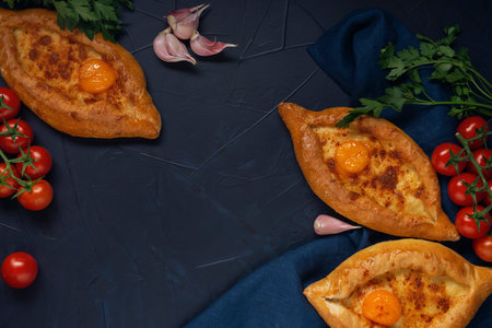 Adjarian Khachapuri – Georgian cheese bread with tomatoes, parsley and garlic on dark blue textured background. Baked open pie with cheese and egg yolk filling. Top view. Flat lay. Space for text.