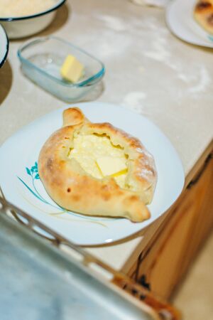 close-up of a small khachapuri in Ajarian. Home cooking, Georgian dishes