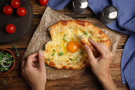 Top view of woman eating delicious Adjarian khachapuri at wooden table, closeup