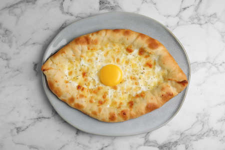 Fresh homemade khachapuri with cheese and egg on white marble table, top view