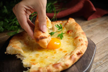 Woman eating delicious Adjarian khachapuri at wooden table, closeup