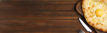 Delicious Adjarian khachapuri served on wooden table, flat lay. Banner design with space for text