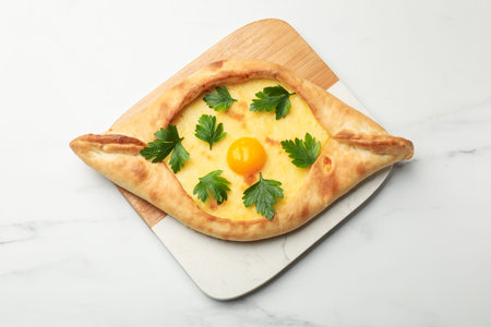 Tasty khachapuri with cheese, egg and parsley on white marble table, top view