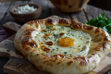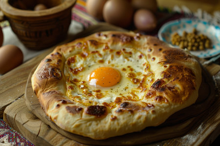 Close-up khachapuri, a traditional Georgian cheese-filled bread, presented in an authentic Georgian setting, providing a cultural context for enjoying khachapuri
