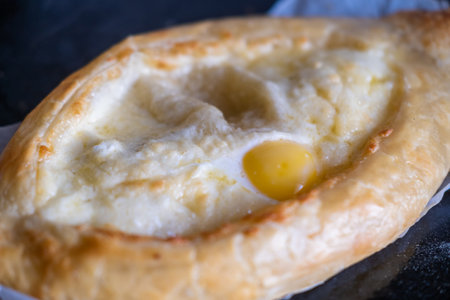 Ajarian khachapuri Georgian cheese pie with egg close-up