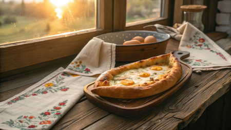 A traditional Georgian khachapuri on a wooden board with eggs and cheese, beside a window with a bright sunset.