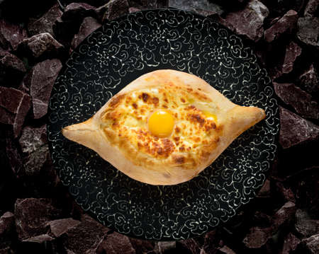 Adjarian georgian khachapuri with egg and cheese national traditional cuisine on a black plate on a background of stones.