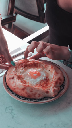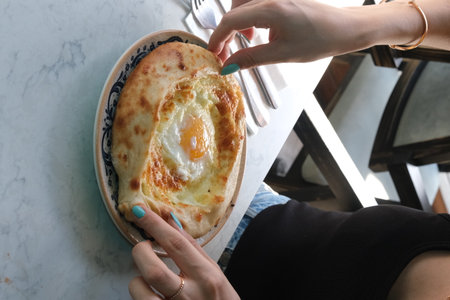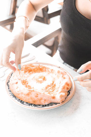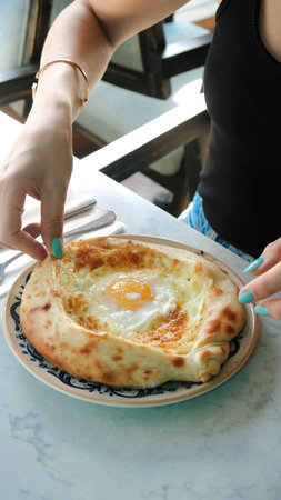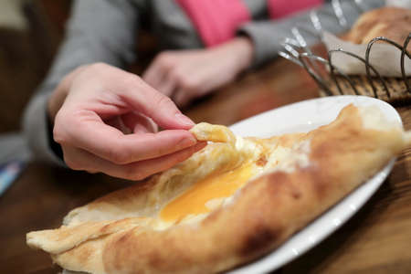 Woman is eating adjarian khachapuri with hands, crushing egg yolk.