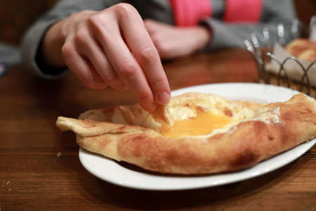 Adjarian Khachapuri. A hand dips a piece of dough into an egg yolk. Traditional Georgian dish with cheese and chicken egg.