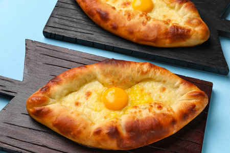 Traditional Adjarian khachapuri pies with salted cheese and egg